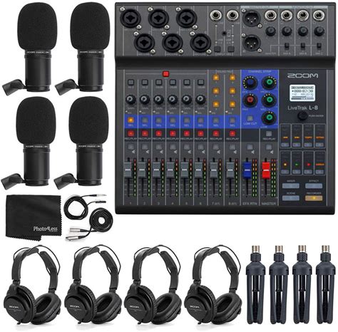 Zoom Livetrak L-8 Portable 8-Channel Digital Mixer And Multitrack Recorder + 4X Zoom Zdm-1 Mic With Headphones, Windscreens And Stands + Cleaning Clot